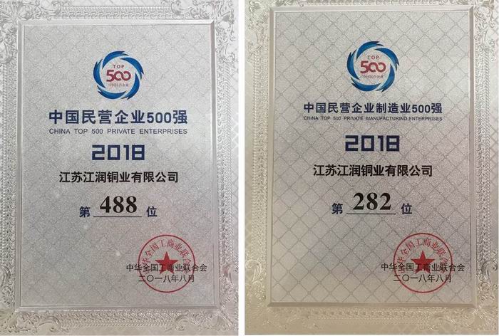 江潤銅業(yè)以營業(yè)收入158.6億元入圍2018年中國民營企業(yè)500強(qiáng),位列第488名;同時(shí)發(fā)布的2018年中國民營企業(yè)制造業(yè)500強(qiáng)名單中,江潤銅業(yè)位列282名。 總體上,2018年中國民營企業(yè)500強(qiáng)入圍門檻繼續(xù)提升、超大型企業(yè)進(jìn)一步增加、質(zhì)量效益穩(wěn)步提高、社會貢獻(xiàn)繼續(xù)加大、產(chǎn)業(yè)結(jié)構(gòu)持續(xù)優(yōu)化、海外投資更趨于理性。與去年相比,2018年民營企業(yè)500強(qiáng)榜單發(fā)生較大變化,有104家企業(yè)新進(jìn)入榜單,受此影響,民營企業(yè)500強(qiáng)入圍門檻繼續(xù)增長,達(dá)156.84億元。