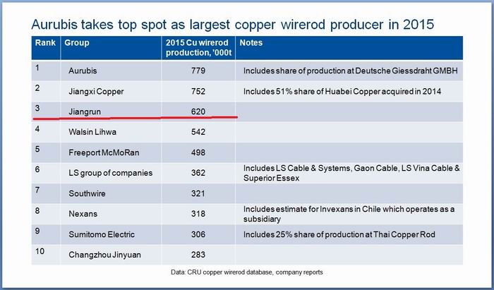 日前,英國商品研究所(簡稱:CRU)發(fā)布了全球銅桿生產(chǎn)商排名,江潤銅業(yè)位列第三。 英國商品研究所是礦產(chǎn)、金屬、電線電纜等行業(yè)內(nèi)世界領(lǐng)先的權(quán)威分析機構(gòu),總部位于倫敦,全球擁有各國專家超過250人,包括經(jīng)濟學(xué)家、管理顧問、工程師、冶金學(xué)家、地質(zhì)學(xué)家、化學(xué)家及媒體從業(yè)人員。多年來,英國商品研究所作為世界知名的金屬市場分析及咨詢公司,以其獨立性和權(quán)威性得到行業(yè)內(nèi)的廣泛認可,其分析報告和數(shù)據(jù)統(tǒng)計被行業(yè)內(nèi)普遍采用和參考。公司擁有兩條年產(chǎn)35萬噸SCR-7000銅連鑄連軋生產(chǎn)線,2015年生產(chǎn)銅桿62萬噸;深加工裸銅線25萬噸、鍍錫銅線2萬噸、束絞銅線6萬噸。江潤銅業(yè)專心、專業(yè)、專注于銅導(dǎo)體研發(fā)制造領(lǐng)域近四十年,未來將繼續(xù)秉承“一流裝備技術(shù)、一流產(chǎn)品服務(wù)、一流客戶市場”的經(jīng)營理念,以信致遠、以精至臻,穩(wěn)健、進取的核心價值觀,踐行工業(yè)理想,肩負歷史使命和社會責(zé)任,引領(lǐng)行業(yè)發(fā)展,創(chuàng)建具備國際競爭力的一流銅加工企業(yè)。