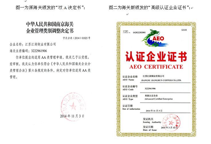 2015年7月30日,由無錫關檢貿組織的“共創共建”啟動儀式在無錫隆重舉行,參會企業共十五家。會議議程為原無錫市15家海關AA類管理的企業直接過渡為海關高級認證企業。江蘇江潤銅業有限公司榮獲由南京海關頒發的“高級認證企業”的稱號,公司總經理駱偉棟參會并領獎?!吨腥A人民共和國海關企業信用管理暫行辦法》去年12月1日實施后,海關注冊企業的管理類別從原來的AA、A、B、C、D類劃分,改為按企業信用狀況劃分為認證企業、一般信用企業和失信企業,其中認證企業又分為一般認證企業和高級認證企業。認證企業在通關時適用較低的貨物查驗率,單證審核程序相對簡化,并可以優先辦理海關通關手續。 高級認證企業,除享有一般認證企業的通關便利外,其進出口貨物在確定商品歸類、原產地確定、海關估價和辦結其他海關手續前可先行驗放,由海關統一設立協調員,提供便捷通關服務。走出國門后,高級認證企業更可享受與中國實現AEO互認國家或地區海關提供的通關便利,這相當于直接獲得一張在全球有關國家或地區快速通關的VIP卡。