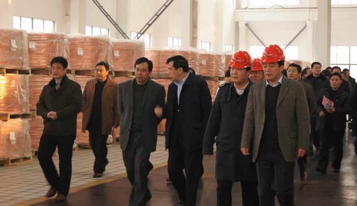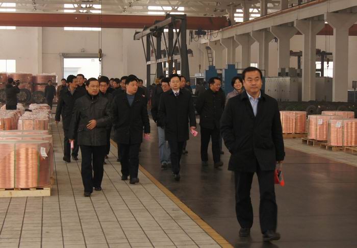 12月21日上午,在市長王中蘇的陪同下,寶應縣黨政代表團來公司參觀考察??偨浝眈槀潫崆榻哟舜韴F一行,并介紹了公司的發展歷程和前景。代表團參觀了SCR銅桿車間、復合銅線車間、銅絞線車間。